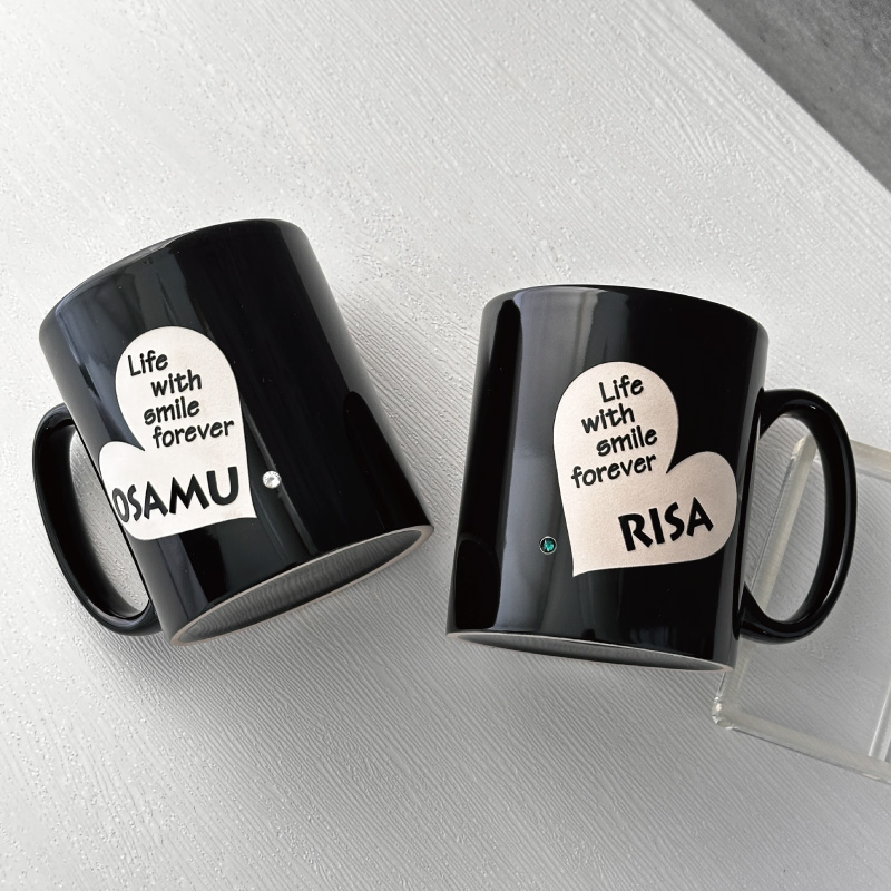 マグカップ 名入れ 名前入れ ペアマグ ハート柄 お揃い カップル ペア (誕生石 スワロフスキー)コップ マグ 記念日 結婚記念 誕生日 黒マグペア ハート